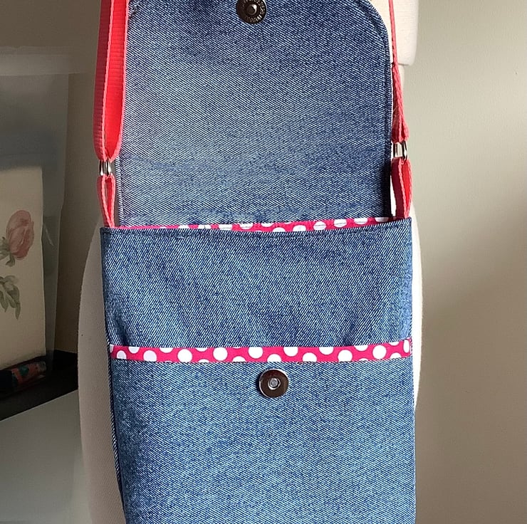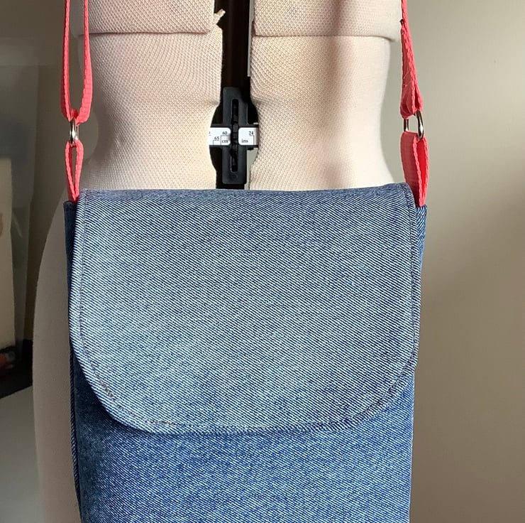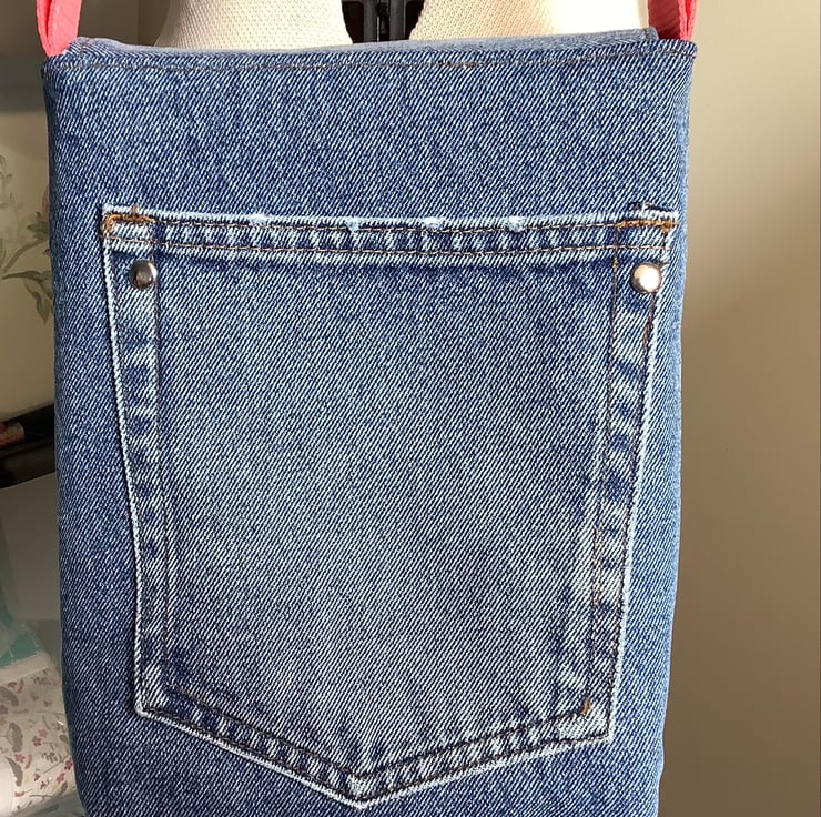 A casual denim handbag for weekends and holidays. Re sewn from traditional denim and colourful cotton print and interfaced throughout to maintain the bags’ shape . Because this is a reworked denim the colour is not consistent due to exposure to washing and wear.