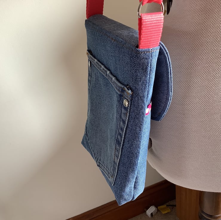Preloved denim shoulder bag. Outside pockets, spacious main body section.