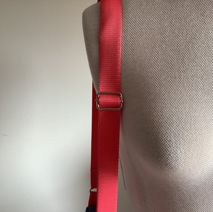 The pink shoulder strap is adjustable and the bag could be worn across the body or on the shoulder .