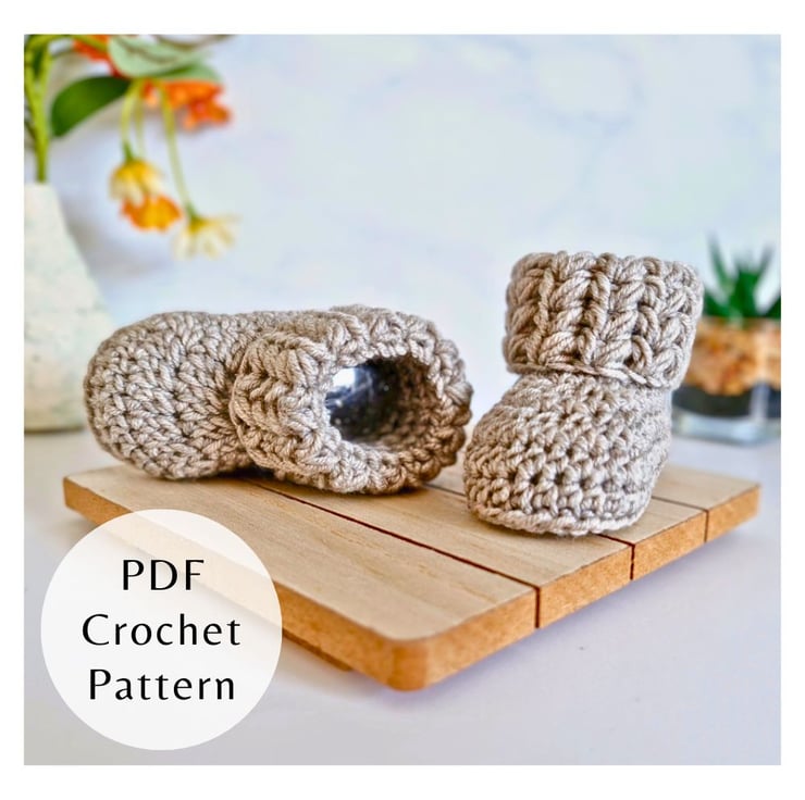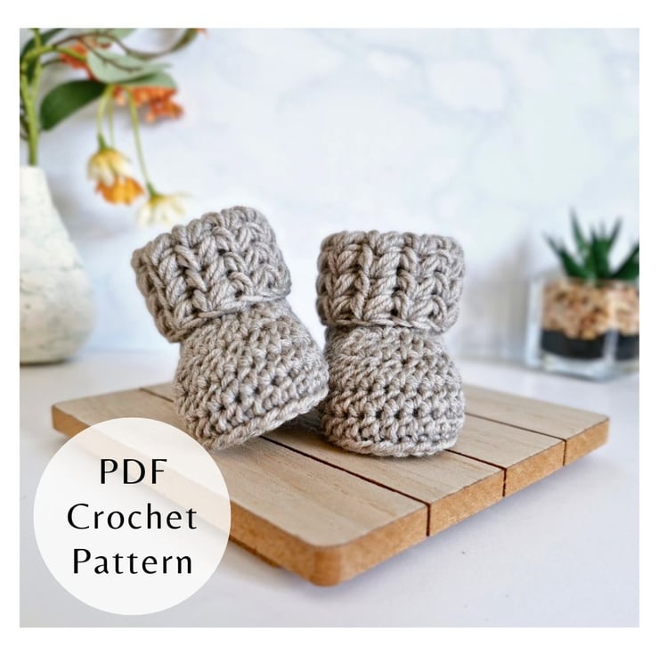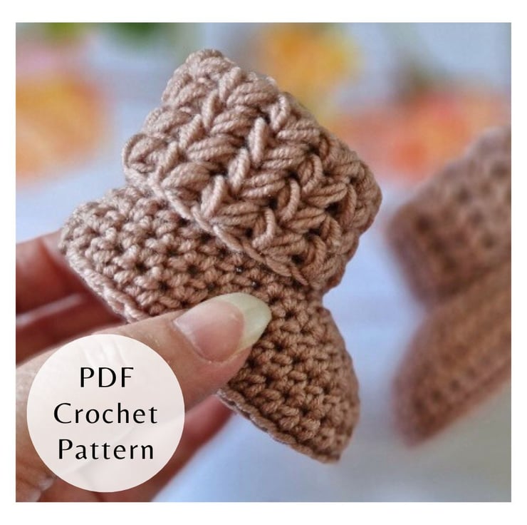 PDF crochet pattern for baby booties with puff V stitch folded cuff. Includes 3 sizes (newborn to 6 months). Perfect for handmade baby gifts.