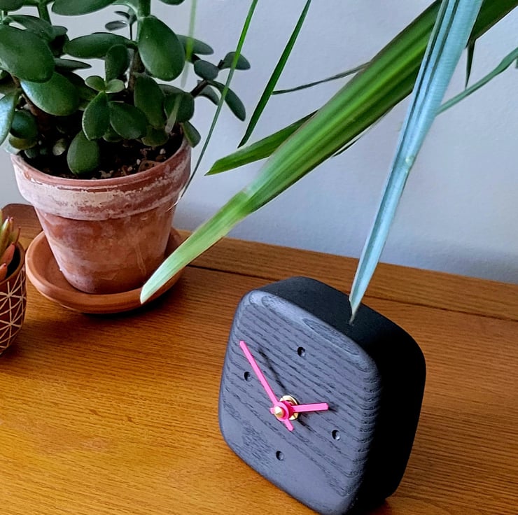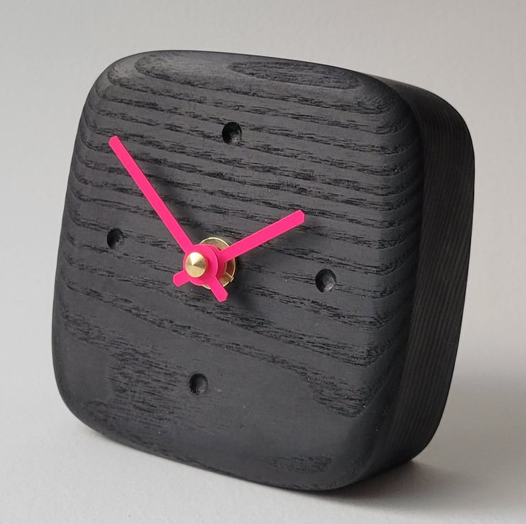 Desk Clock - Ebonised Black Oak & Neon Pink Hands Dot Indicators
