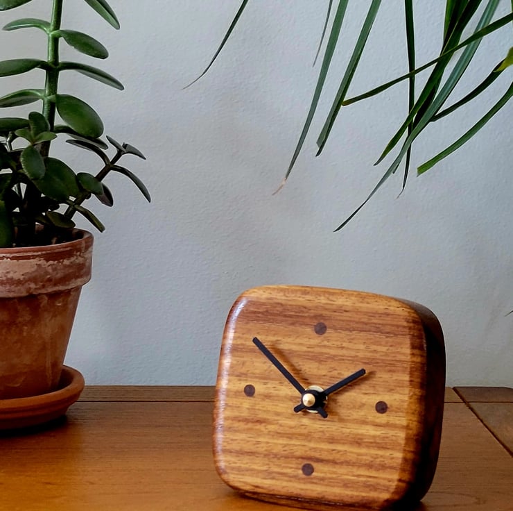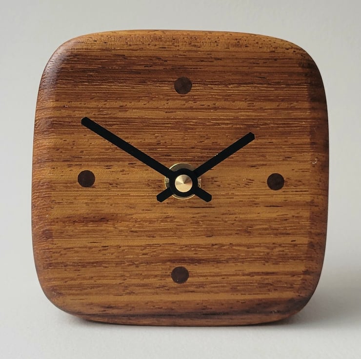 My Desk/Mantel Clocks are handmade from a solid piece of Iroko (African Teak), and Walnut "dot" indicators, marking 12, 3, 6 & 9 o'clock.