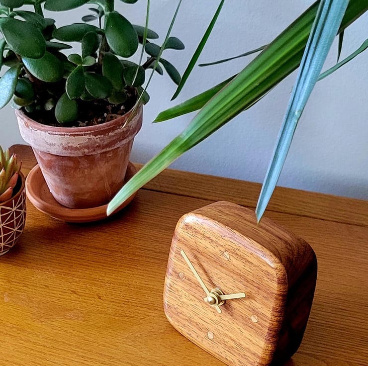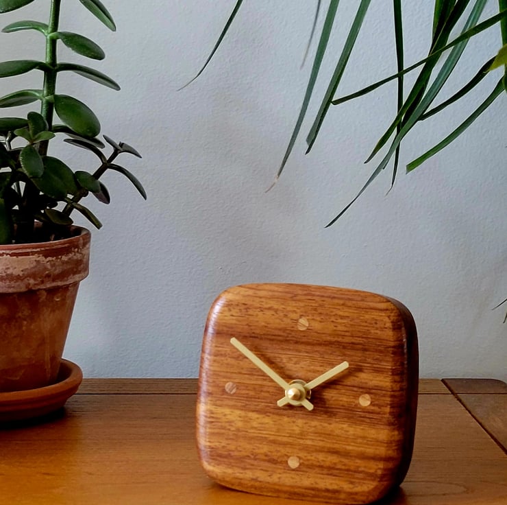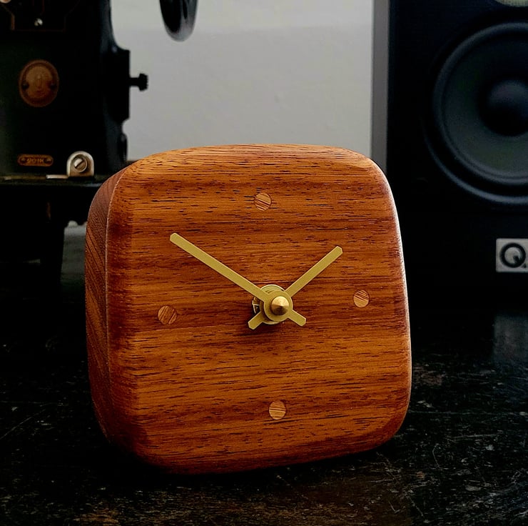 My Desk/Mantel Clocks are handmade from a solid piece of Iroko (African Teak), and Oak "dot" indicators, marking 12, 3, 6 & 9 o'clock.