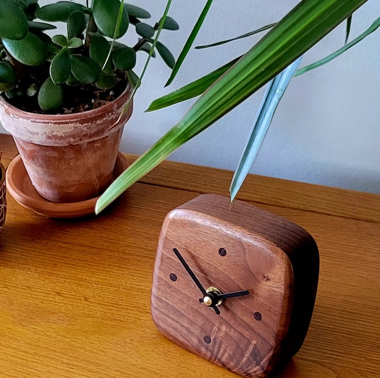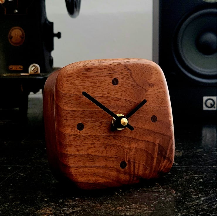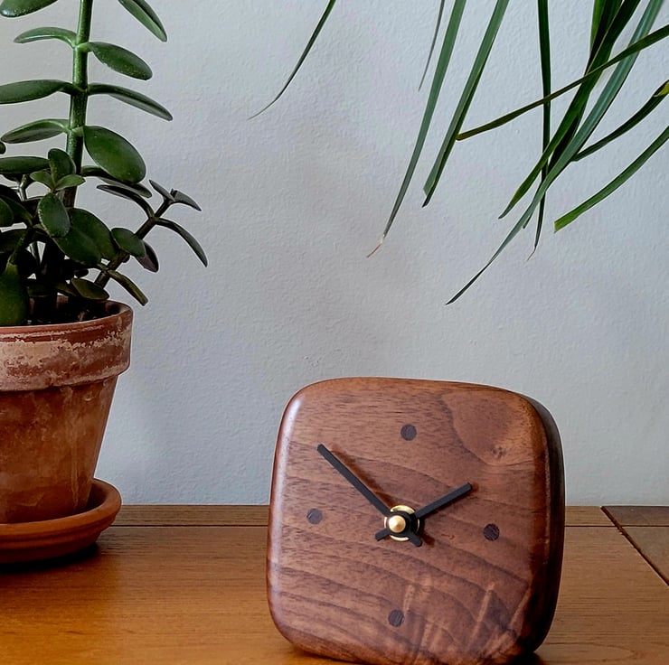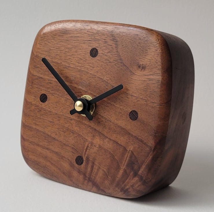 My Desk/Mantel Clocks are handmade from a solid piece of American Black Walnut, with Ebony "dot" indicators, marking 12, 3, 6 & 9 o'clock.