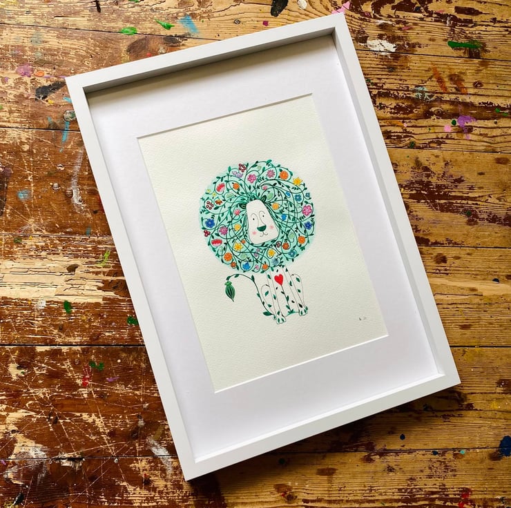 This beautiful floral lion isn't the fiercest in the pride, but he's definitely the most beautiful ! Measuring 21 x 29.6 cm and set in a simple white frame measuring 32 x 44cm, painted using gouache and watercolour, this gorgeous painting would make a perfect gift!