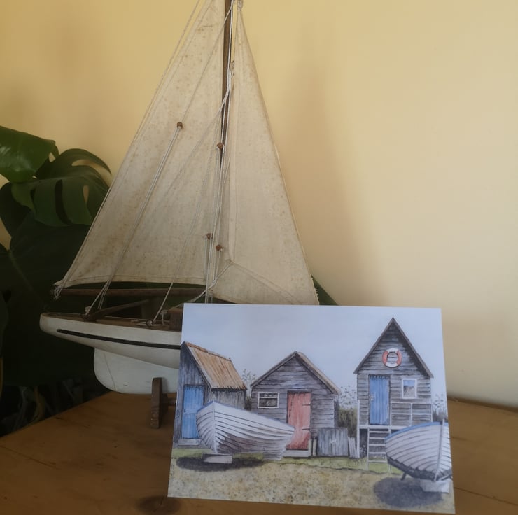 The boat houses is a greetings card printed from an original watercolour and ink painting by Elaine Curtis. It is left blank for your own message.