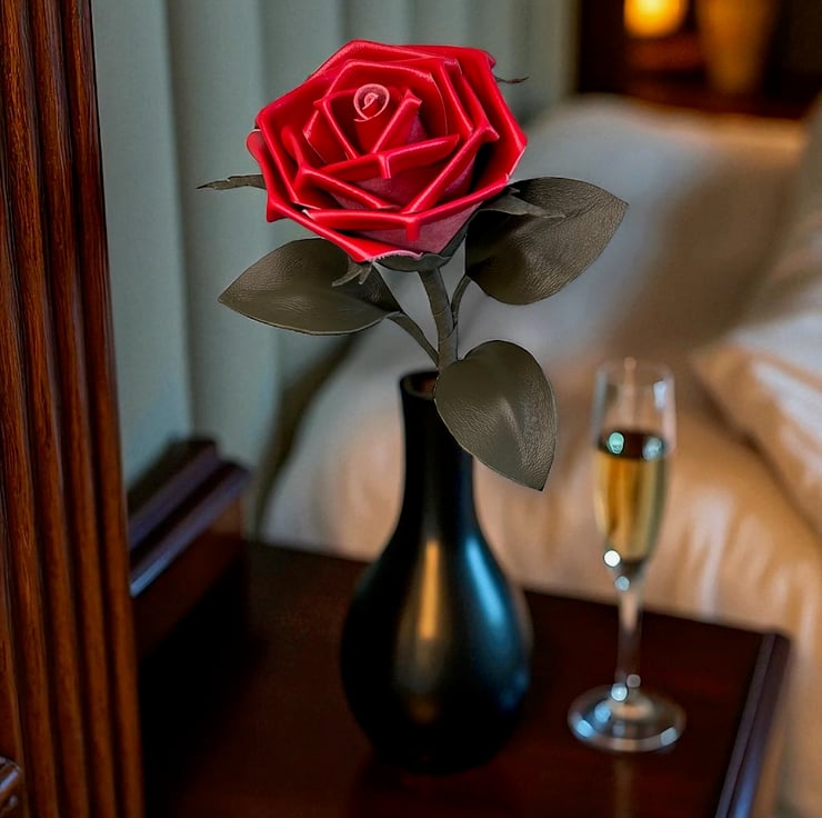 Each rose is individually handmade and stands around 40cm tall. The petals are crafted from soft Italian lambskin in a rich, romantic red. The stem and leaves are made from green leather, reinforced with wire so they can be gently shaped to your liking.