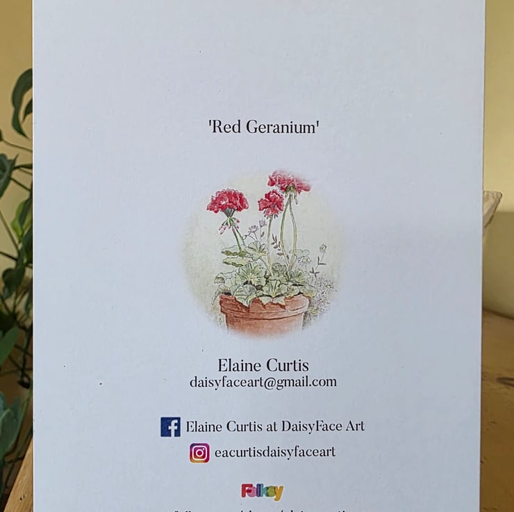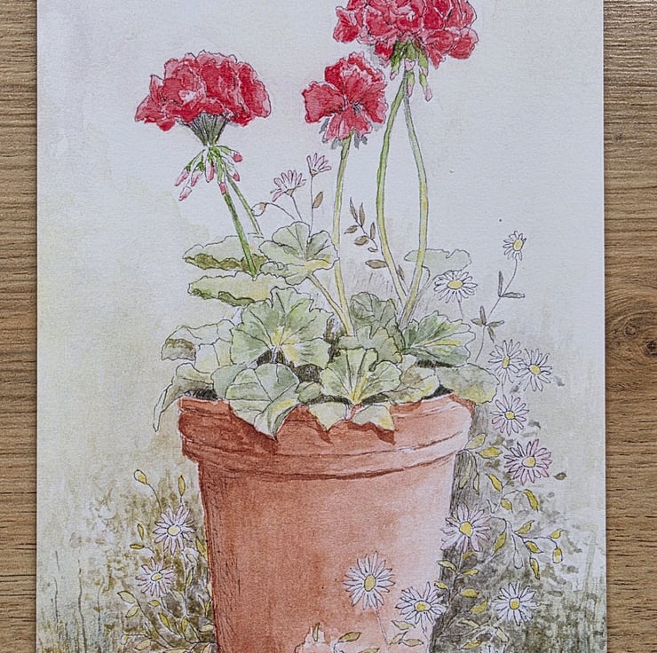 'Red Geranium' is agreeing card which features a red geranium in a terracotta poy, surrounded by daisies. It is based on an original watercolour painting by Elaine Curtis.