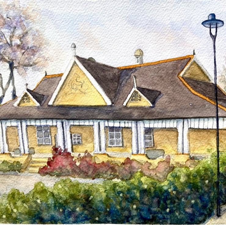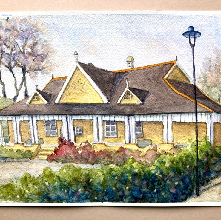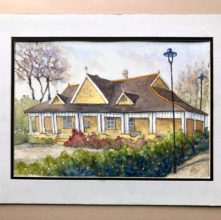 This is a colourful architectural painting of the beautiful cafe in Aston Gardens in the heart of St Annes. I was very pleased with how this painting turned out. I love the splash of pure yellow among the nature of the Gardens. I wanted to highlight the wonderful different architecture of the building, which has a nod, I think, to Asia.