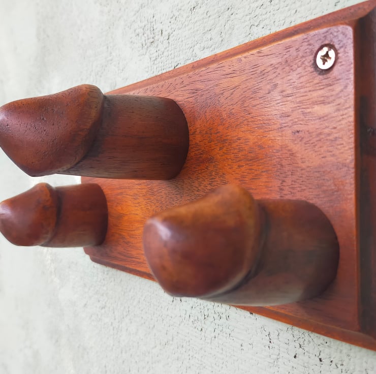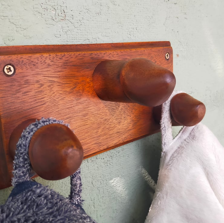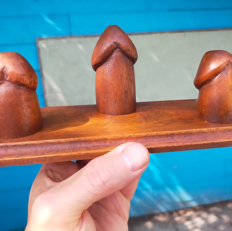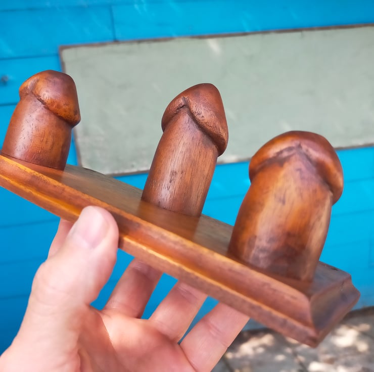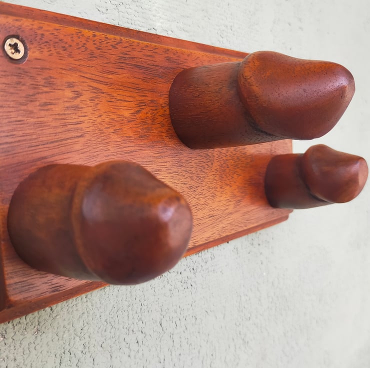 Want something a little more interesting to hang your dressing gown, bath robe or towel on? My novel hooks are designed for the bedroom or bathroom door of the more adventurous. Each appendage is individually hand-carved from reclaimed mahogany, sanded, stained, polished and waxed, and firmly screwed and glued to a mahogany backplate. The backplates are all different sizes as I have had to cut around the many nail holes in the original timber, so please do check dimensions carefully. The entire range of Choads, Packets, Stiffies and Shrooms is hand-carved from Brazilian mahogany - now a rare and protected timber - but reclaimed from a farm near Clitheroe, built in the 1950s. This timber served its purpose as the rafters of a barn, but is now living again as a limited run of cheeky household sculptures. As can be seen from the reverse pics, the timber is a light reddish brown but I wanted to create a darker and more distressed patina: I wanted these pieces to look like they had been recovered from an abandoned Victorian molly house. None is perfect: all have some flaw or other, and I have tried to highlight those in the photos. After all, if they were all identical how could you have a favourite? Each of this limited run has been named, numbered and signed by myself to make them even more unique.