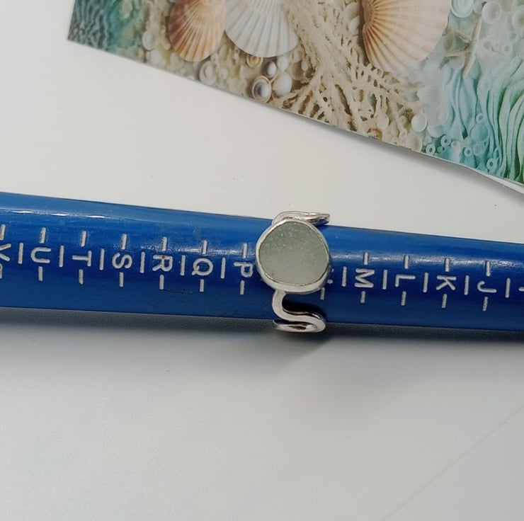 The ring size is a size N 1/2 , the total band width is approximately 1.1 cm x 1.5 mm thick, the sea glass is approximately 1.2 cm