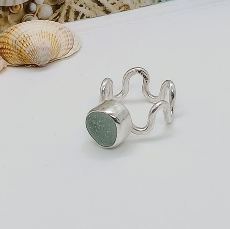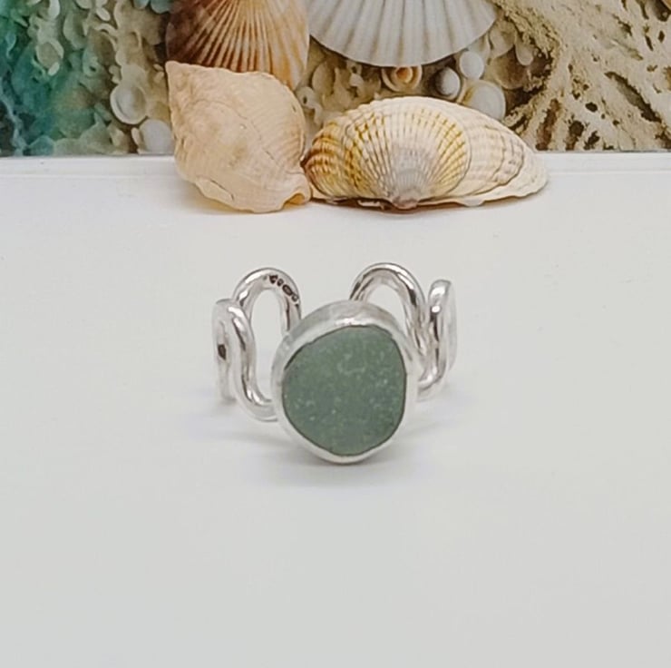 Pale green sea glass collected from Seaham has been set into a rubover bezel setting on a wide ring band of smooth waves .