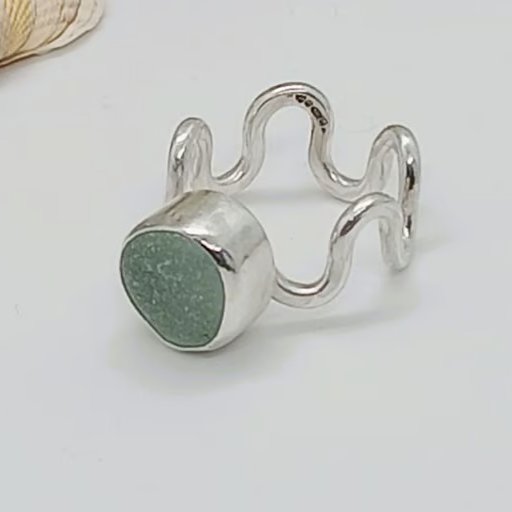 Pale green sea glass collected from Seaham has been set into a rubover bezel setting on a wide ring band of smooth waves .