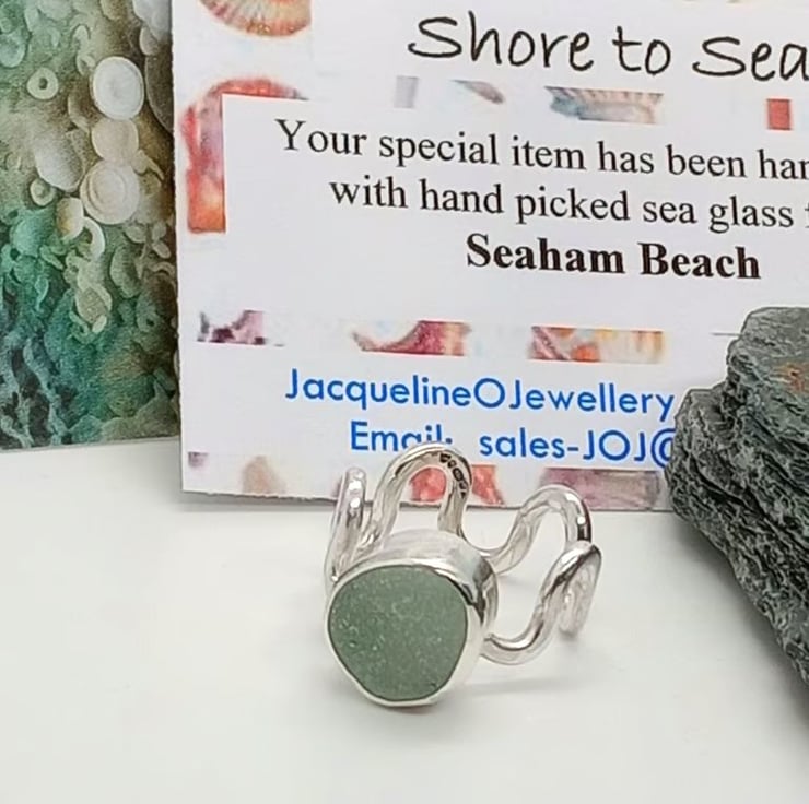 The beautiful natural light frosted sea tumbled sea glass was collected by myself from Seaham beach, the transparent glass is almost circular but in a freeform shape created by the tumbling of the sea, I made the smooth wavey ring band and the setting to fit the glass.