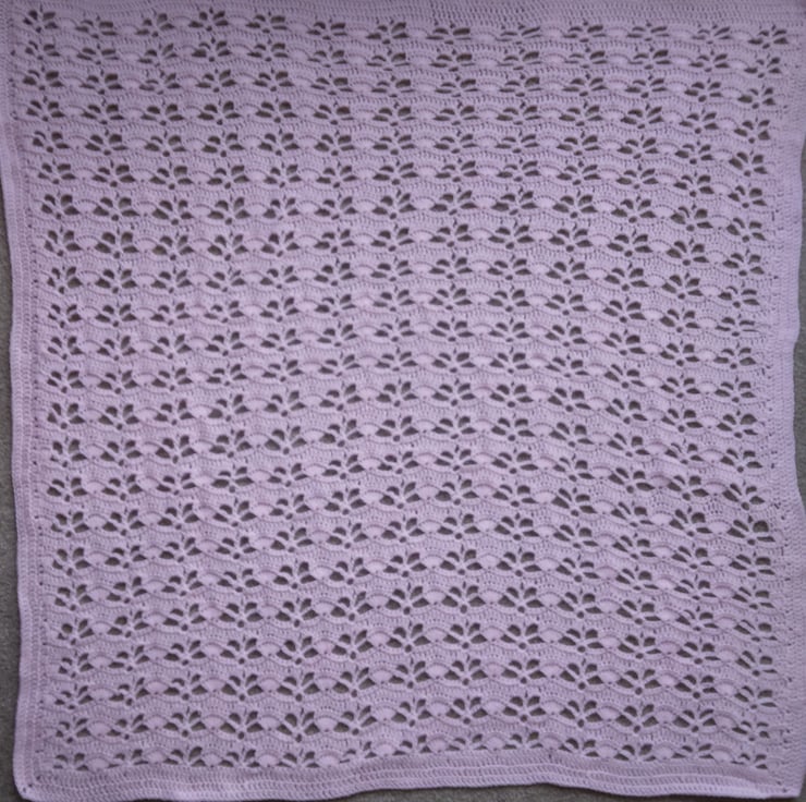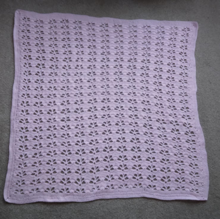 Crochet baby blanket or shawl in butterfly stitch. Pink super soft baby acrylic, machine washable. Handmade, measures approx 36 ins (92 cm) square. Ideal for a new baby or as a gift. This can be made to order in other colours, blue, lemon, pale green, lilac, white or cream but since it is handmade please allow more time as it takes many hours of work.