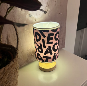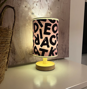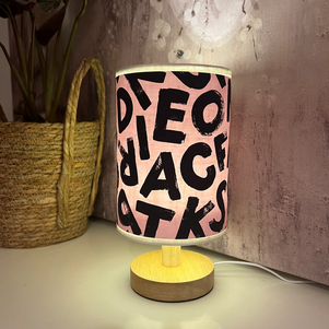 Handcrafted table lamp, featuring a pink cylindrical shade adorned with bold black typography. Set on a smooth wooden base, this lamp blends playful design with minimalist charm, making it a perfect fit for bedrooms, home offices, or creative corners.