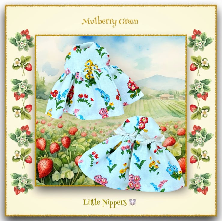 A sweet little flowered dress, in a Liberty Kensington Gardens print, made especially to fit the Little Nippers. The dress fastens at the back with a little popper and has two little bows at the back.
