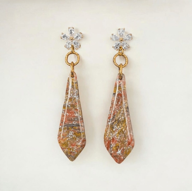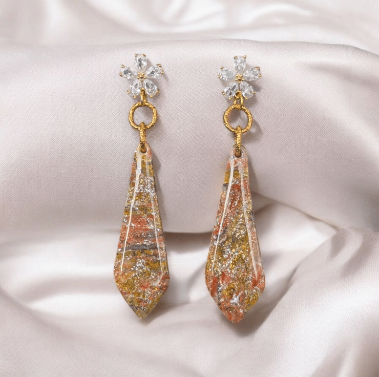 These earrings are made of Resin, gold leaf foil, white Acrylic paint, Gold Findings and Polymer Clay, a durable and versatile material that can withstand wear and tear, they are lightweight making them comfortable to wear for extended periods.