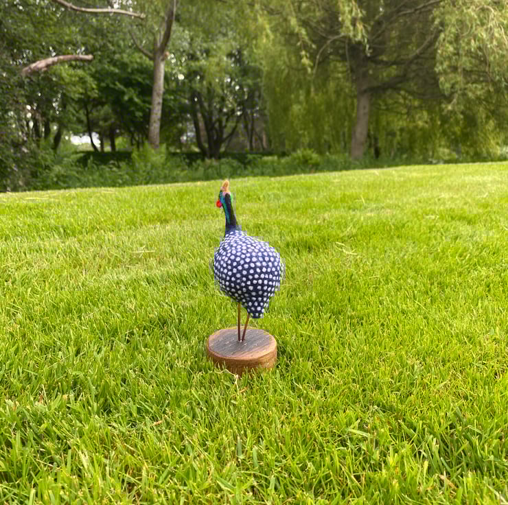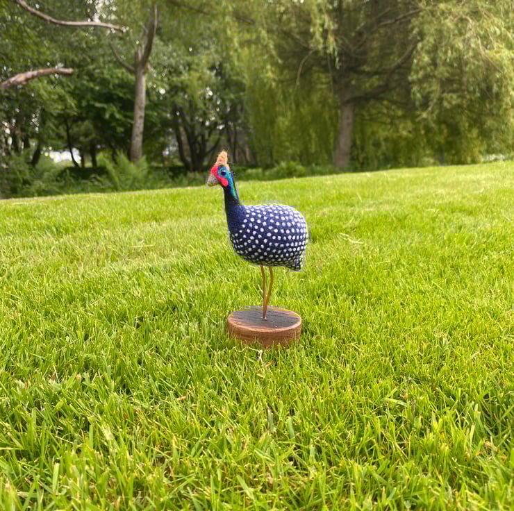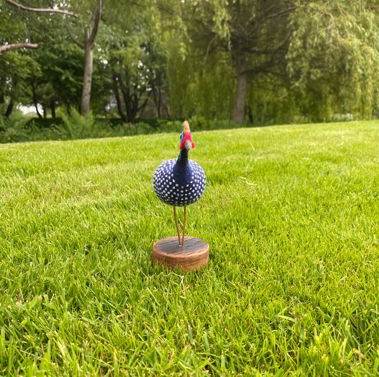 This beautiful wee Ginuea Fowl has been meticulously handmade from soft felted wool. His spotty coat has been applied by hand with a single barbed felting needle, taking hours to complete!