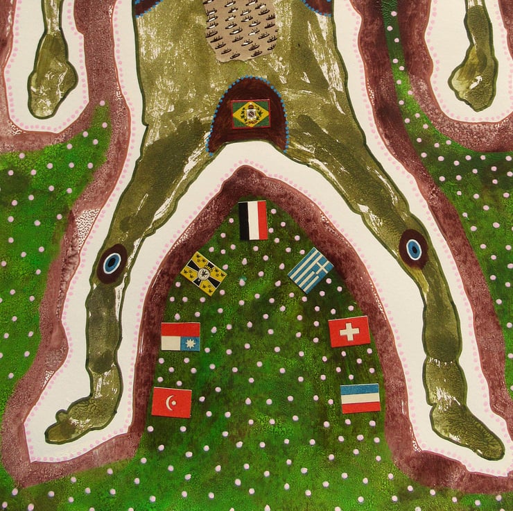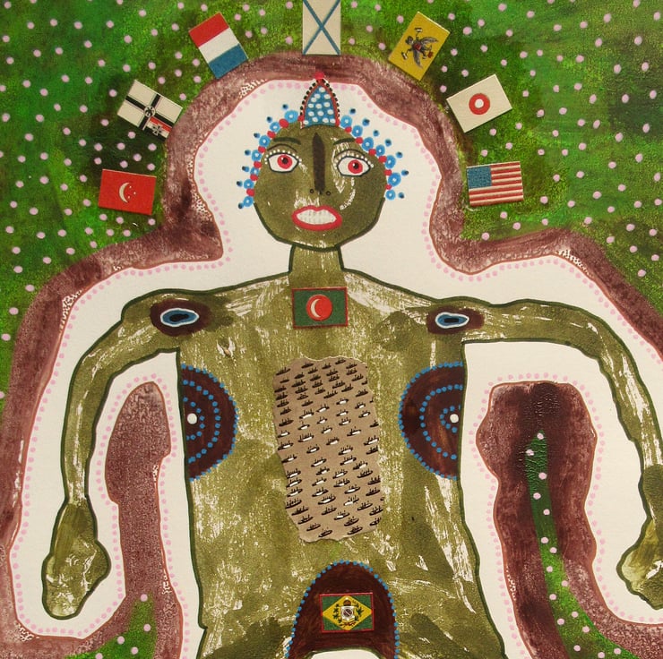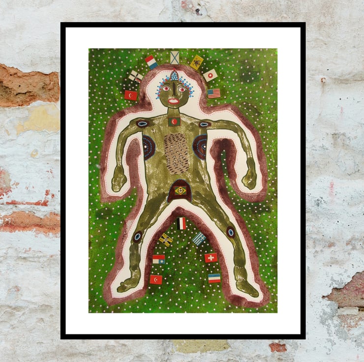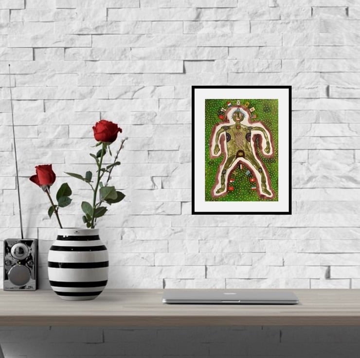 Medium to large format figurative mixed media artwork in acrylic, collage and drawing pens, on thick mixed media paper. A quirky and unusual piece of original unconventional art, measuring 11.75 x 16 inches depicting a figure, drawing inspiration from outsider art, folk art and tribal traditions, embodying a raw, intuitive energy with a spark of humour. Add a touch of authentic, eclectic style to your home, office, or art collection. This painting stands out from the ordinary and is the ideal acquisition for collectors of contemporary folk art, primitive art, or anyone seeking an expressive and thought-provoking focal point for their interior. It comes to you unframed and will be signed on the front by Bea before shipping. (Framed photos are for illustration purposes only.)