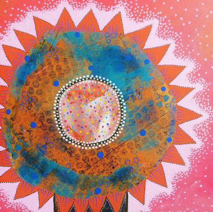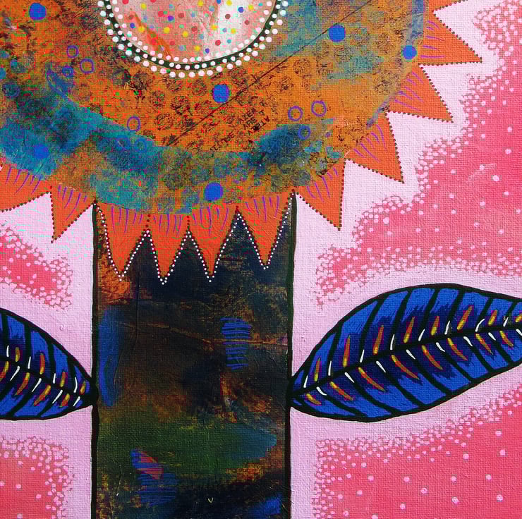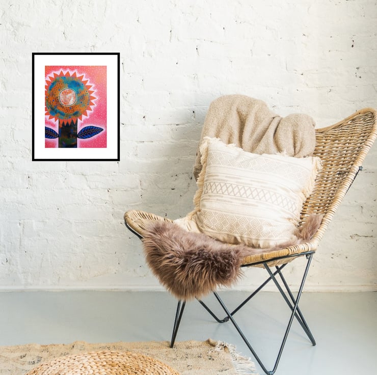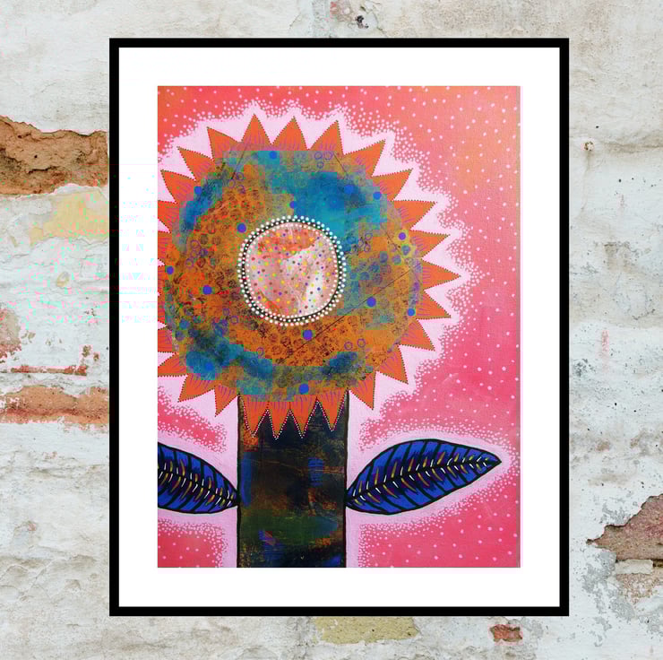 Acrylic, collage & drawing pens combine in this uplifting artwork measuring 30 x 40 cms (11.75 x 15.5 inches ) on canvas textured heavy art board. Bring vibrant floral beauty & whimsical colour to your interior with this unique floral artwork. Perfect for art lovers who crave originality and whimsy. This standout piece will be hand signed by Bea before shipping and comes to you unframed. (Framed photos are for illustrative purposes only.)