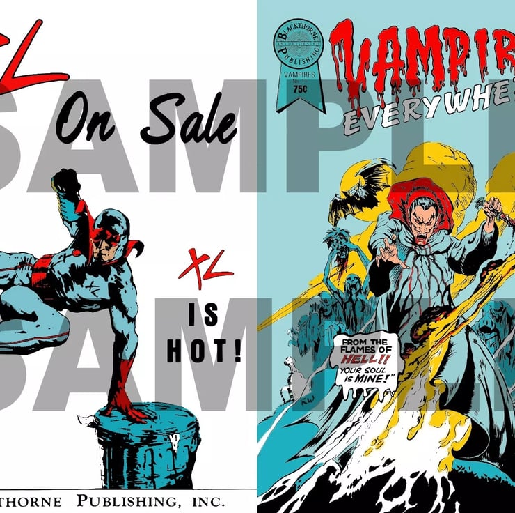 This item was hand drawn by myself to match the comic "Vampires Everywhere" as close as possible. I was lucky enough to obtain a copy of the actual screen used comic and you will not get a more accurate replica. This is an almost exact Replica of the Comic Book seen in the movie "Lost Boys" when the Frog Brothers hand Sam a copy of the comic in the comic store scene. The cover was hand drawn, scanned and coloured by myself in photoshop. I have not seen this item available anywhere else. The print is of both the front and back image as seen in the movie and measures 26.3cm x 16.2cm (exact size as the original). This Replica comes in a Sealed Comic Book Bag with a backing card, you can add an old comic inside to make it look more authentic if you wish ( the original comic that was used in the centre of the prop was "Vanity" No.1) . This will look fantastic Framed in any collection or even in a comic book store if you have one.