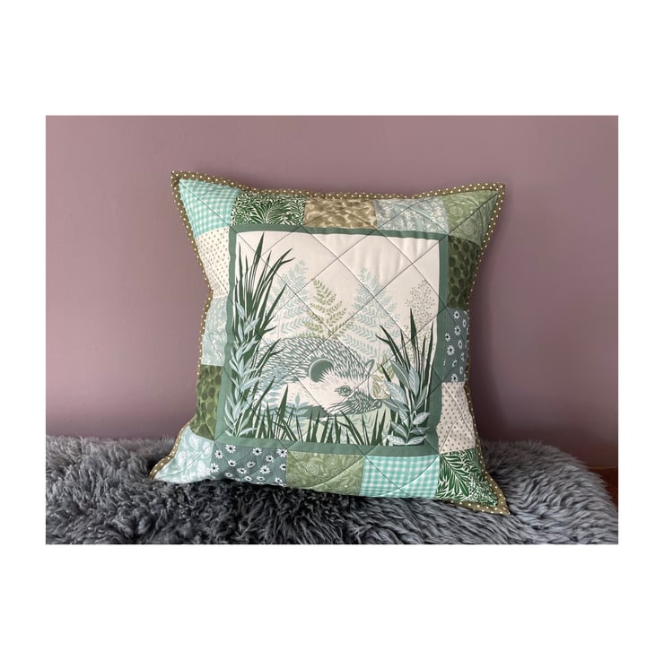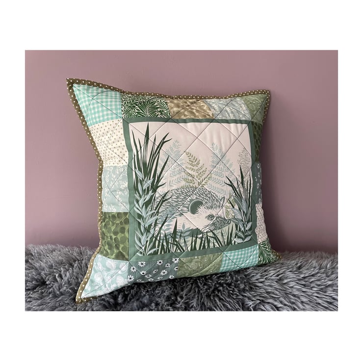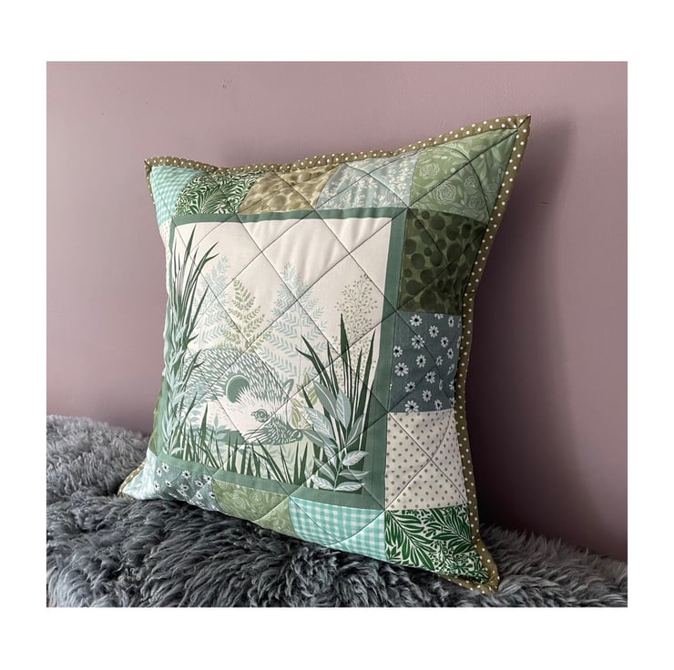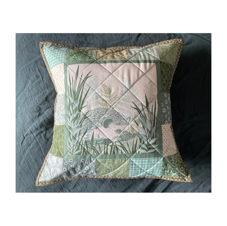 Quilted cushion cover with Mr Hedgehog. Featuring beautiful sage green fabrics. It fits 43cm x 43cm cushions. But if you want to make it nice and plump, 45cm x 45cm is perfect ( I used 45 cm x 45cm when photographing). Cushion is not included. Cover only.