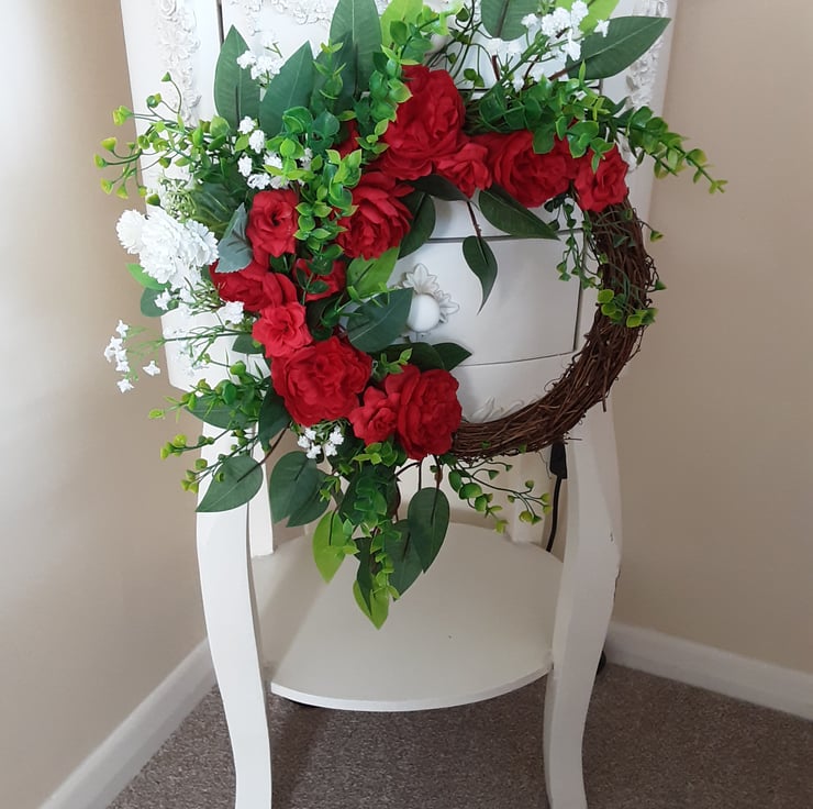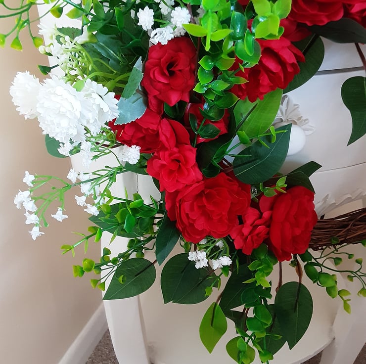 Half covered wreath, with medium and small red roses, white daisies, white gypsophilia and