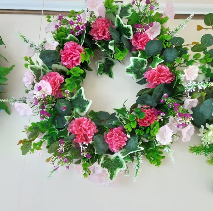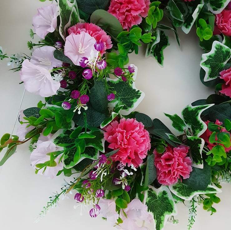 40cm, pink carnations, petunias, purple babies breath with green and white foliage.