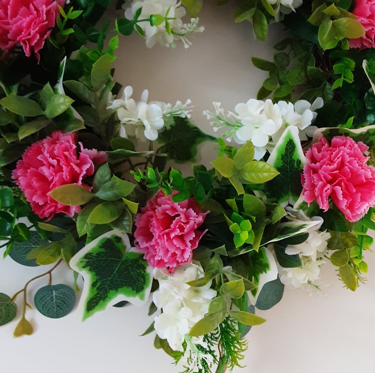 Mixed greens foliage, with pink carnations and white wisteria.