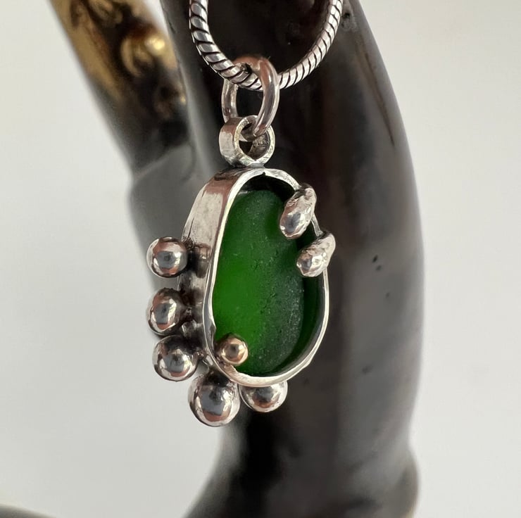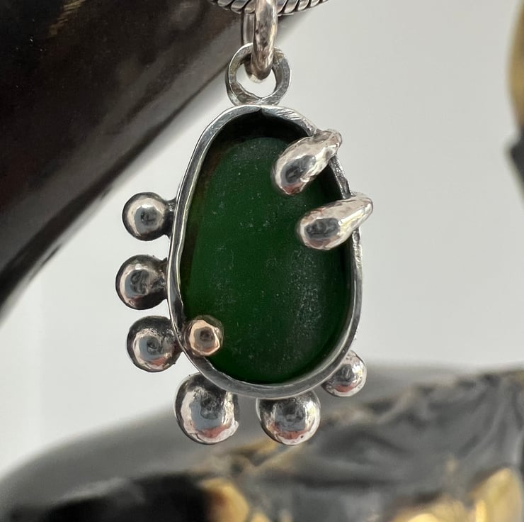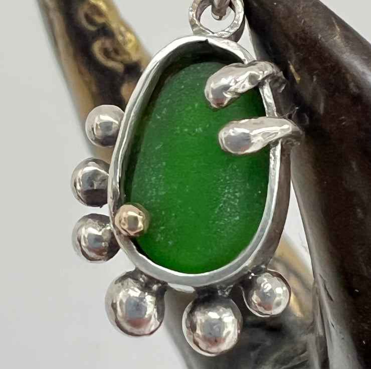 This Sussex sea glass (found on Winchelsea Beach in March 2025) has been set in recycled sterling silver with granulation and a deliciously chunky pair of claw settings. The stunning green glass contrasts fabulously with a small ball of 9ct gold. This pendant has a lovely weighty feel and is a true one of a kind.