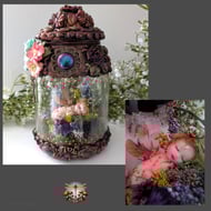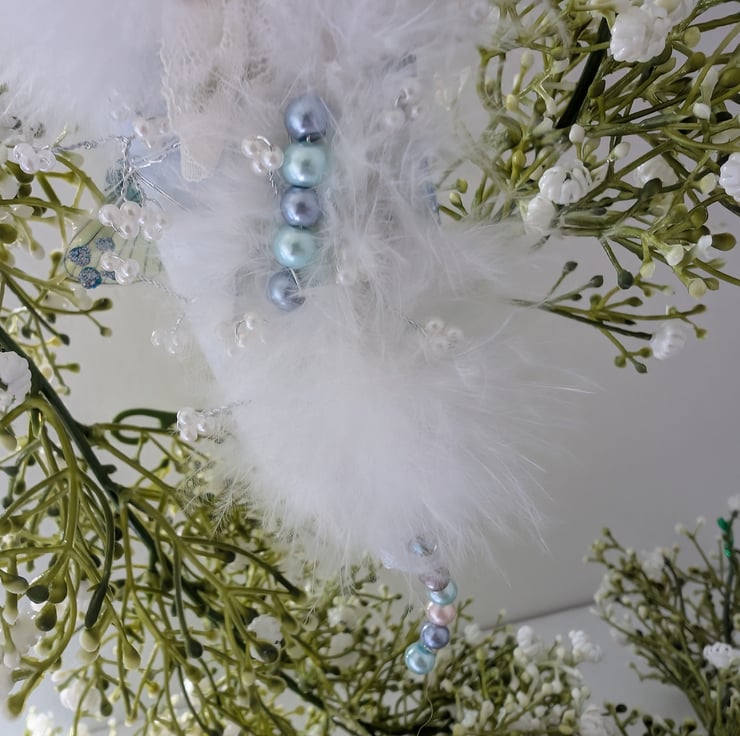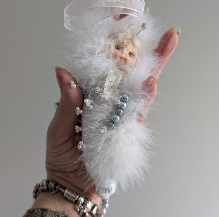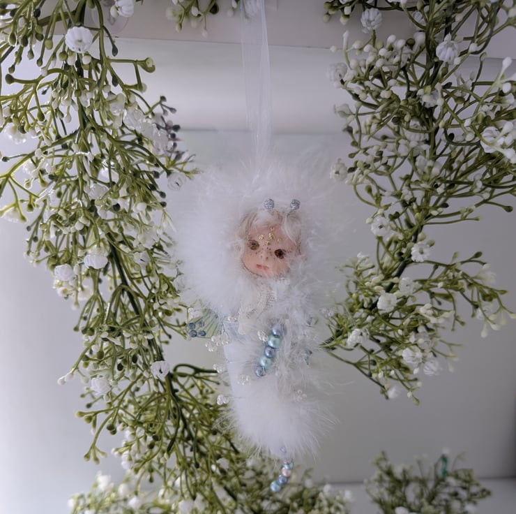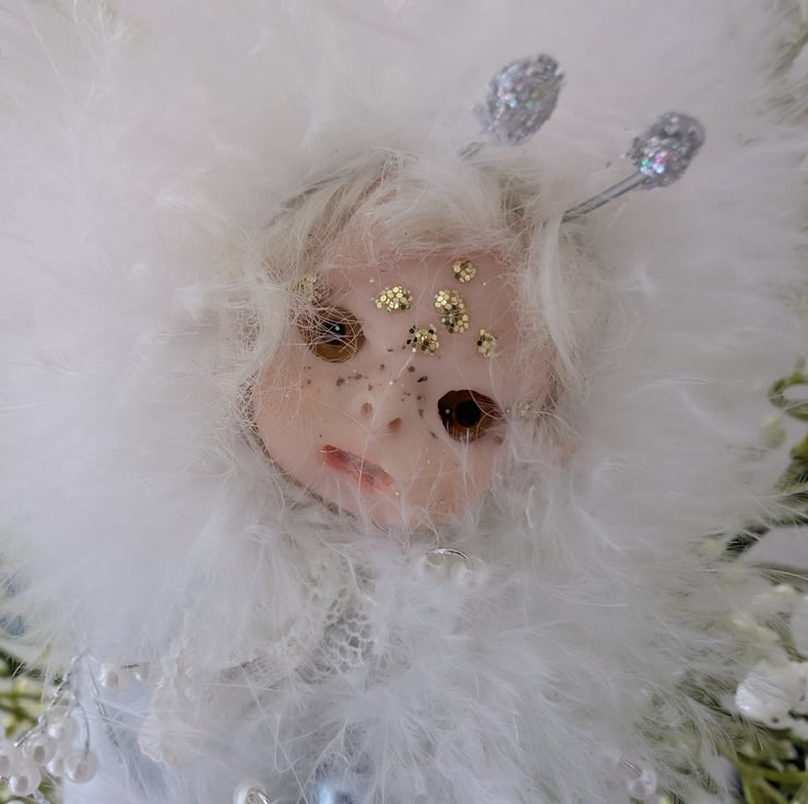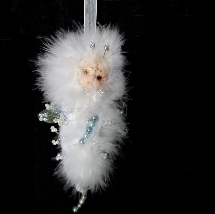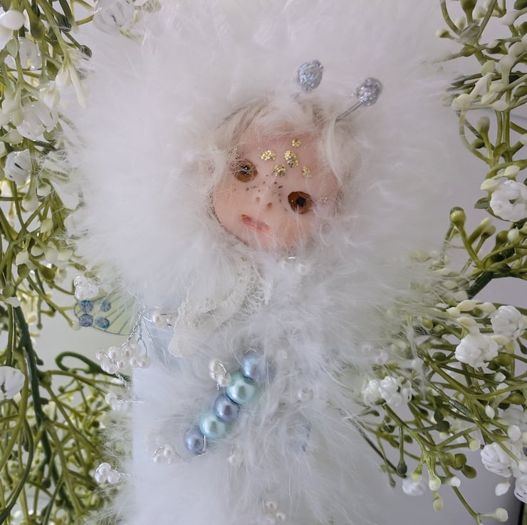 Cheeky little Rustic Baby Fairy who is wrapped up tightly and has ribbon to hang from a bed post or wherever you choose to keep her. This little Fairy was created with 2 different coloured eyes which makes her even more special. She does not like the outdoors as she does not like to be cold or wet. This little Fairy's Cocoon is all white covered in fur to the front and little beads of white and beads of ice colours. Handmade and would bring a lovely bit of magic into anyone’s life.