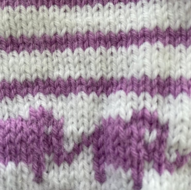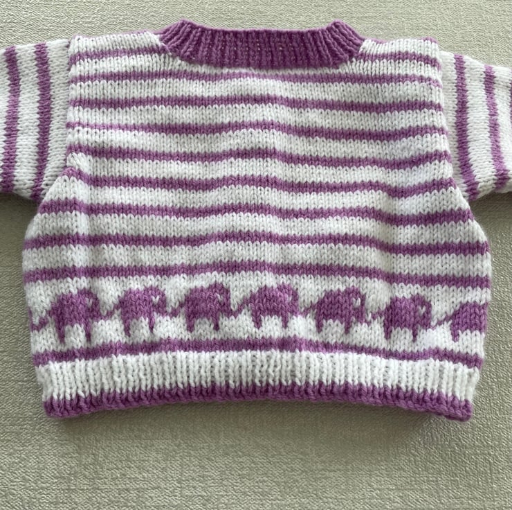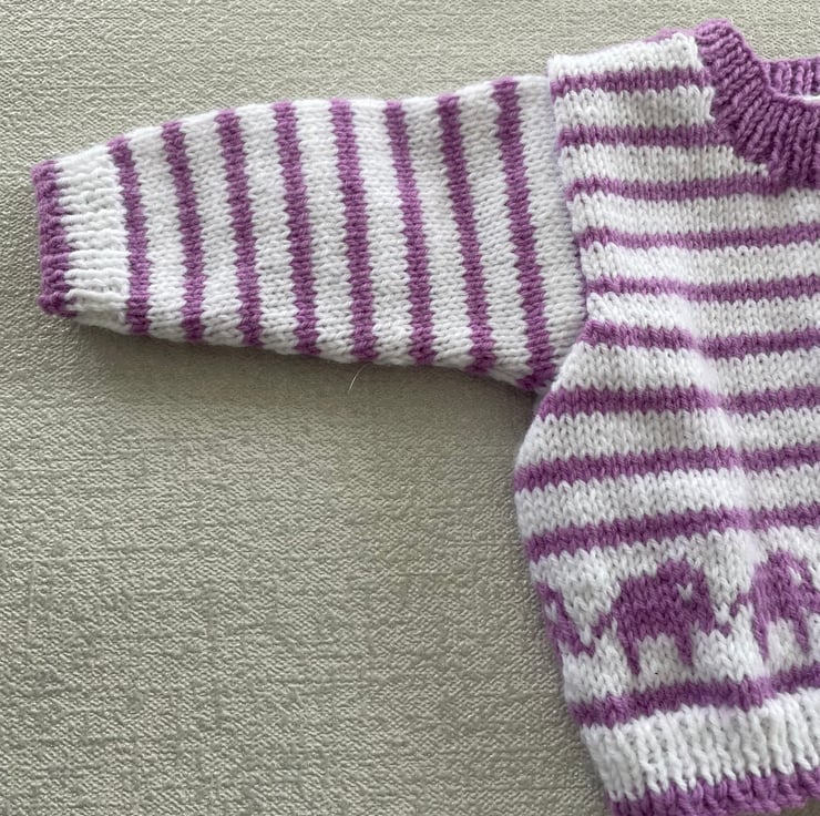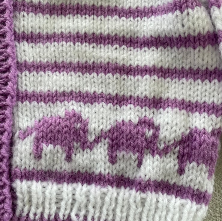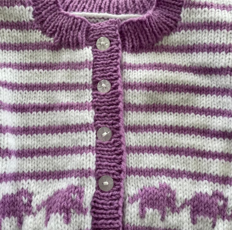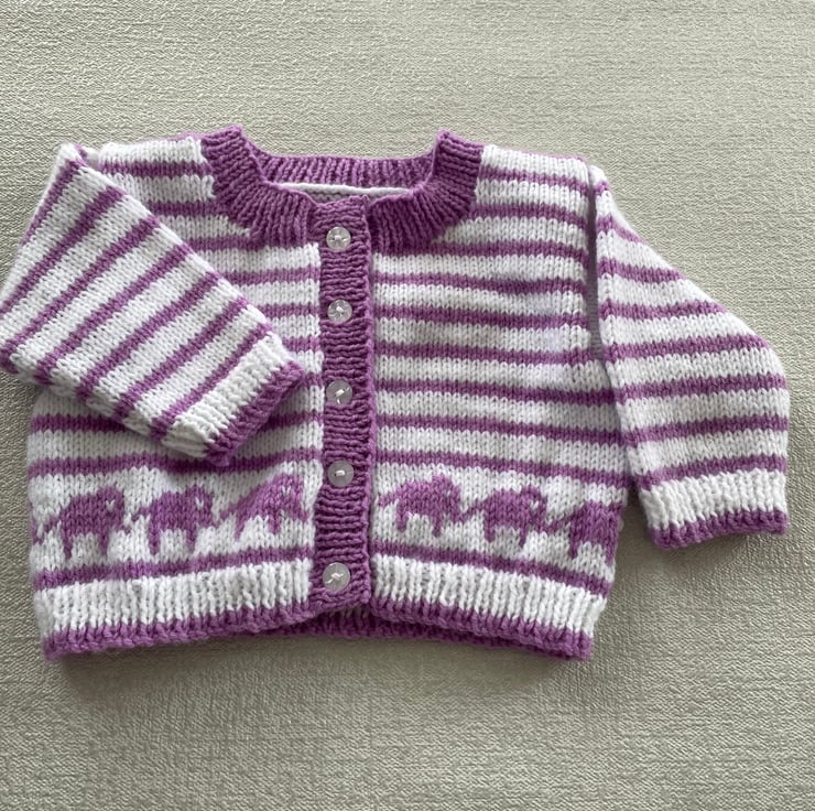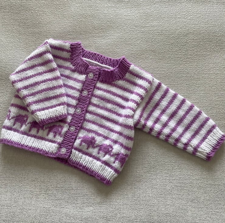 A hand knitted baby cardigan worked in a soft baby yarn. It is striped in white and purple and has a fair isle band of elephants round the bottom