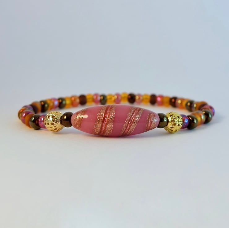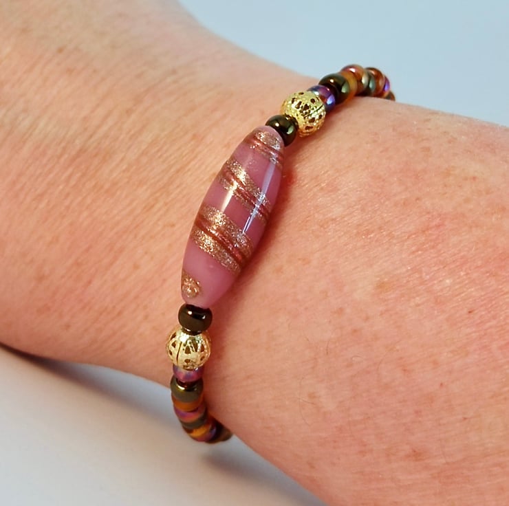 The central bead is a handmade lampwork glass oval measuring 25x10mm in a dusky pink colour with swirls of sparkly gold and dark red.