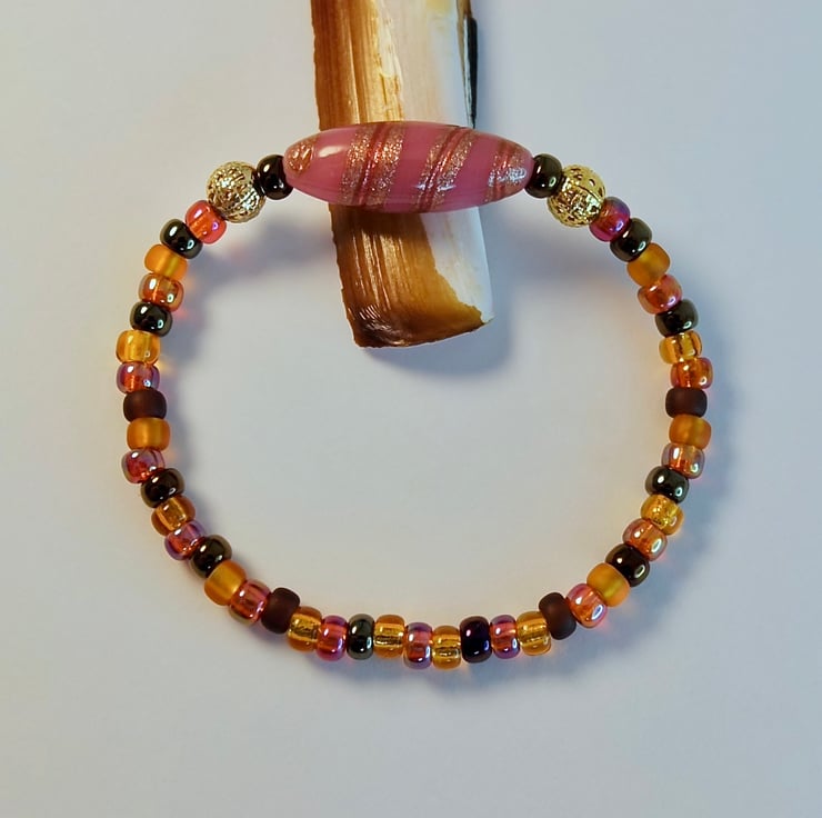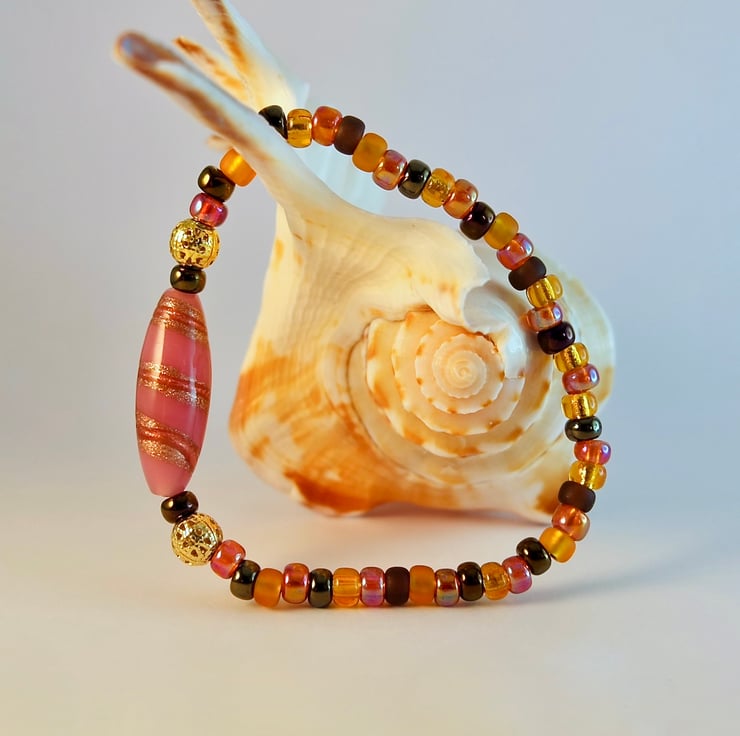 The focal bead is highlighted with 6mm gold plated filigree beads, and is set amongst 4mm seed beads in shades of yellow, amber, pink and brown.