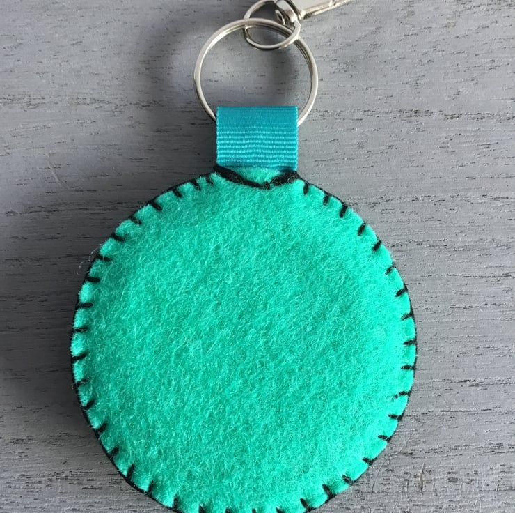 This circular embroidery is 2.50 inches (6 cms) in size, with stiff card inside. A metal lobster catch is secured at the top with a turquoise blue ribbon……ready to accessorise a bag or to attach a key.