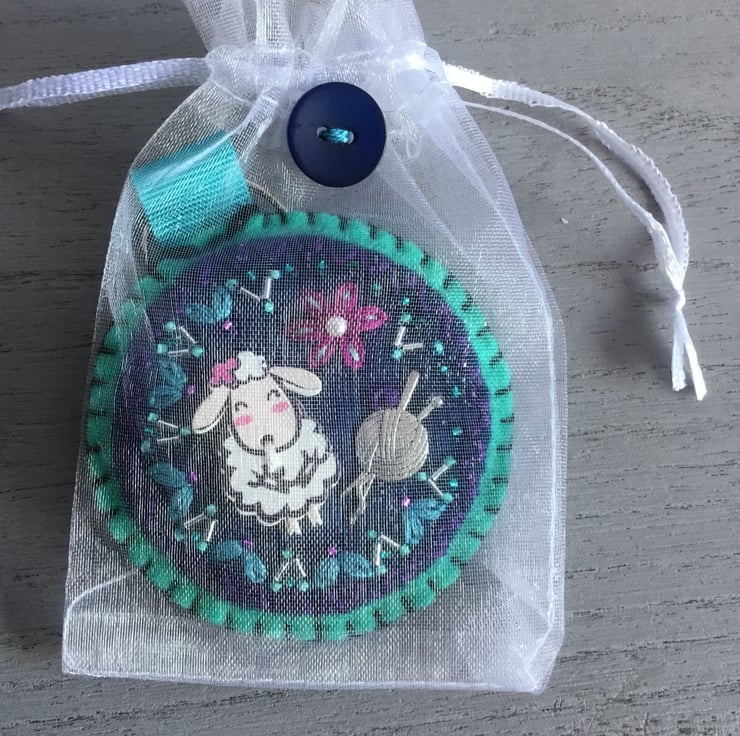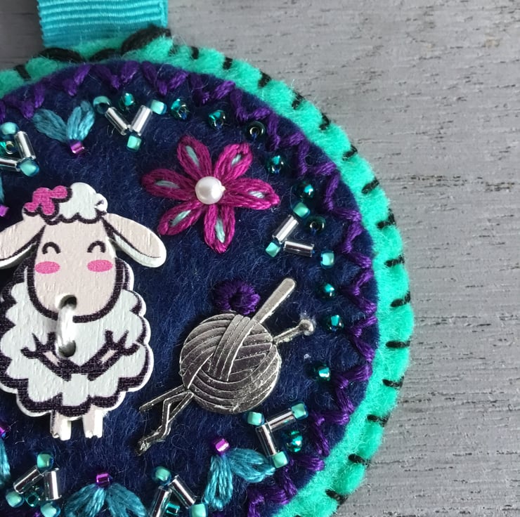 It has a Knitting scene…showing a Yorkshire sheep. A wooden Sheep Button and a metal Charm of a Ball of Wool with Knitting Needles are sewn onto circles of dark blue and turquoise blue wool felt. These are surrounded by hand embroidered Petals and a Flower, dotted with small silver and turquoise seed beads.