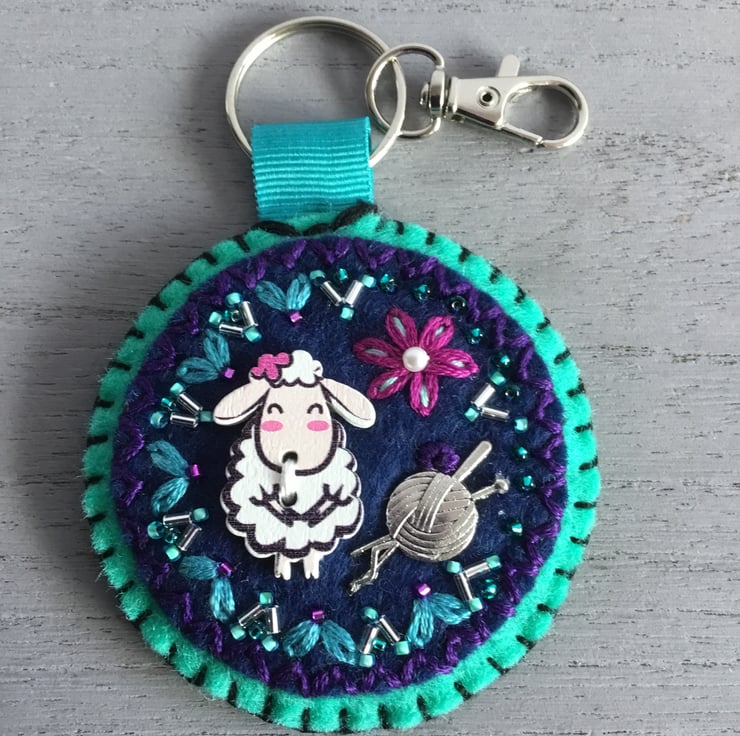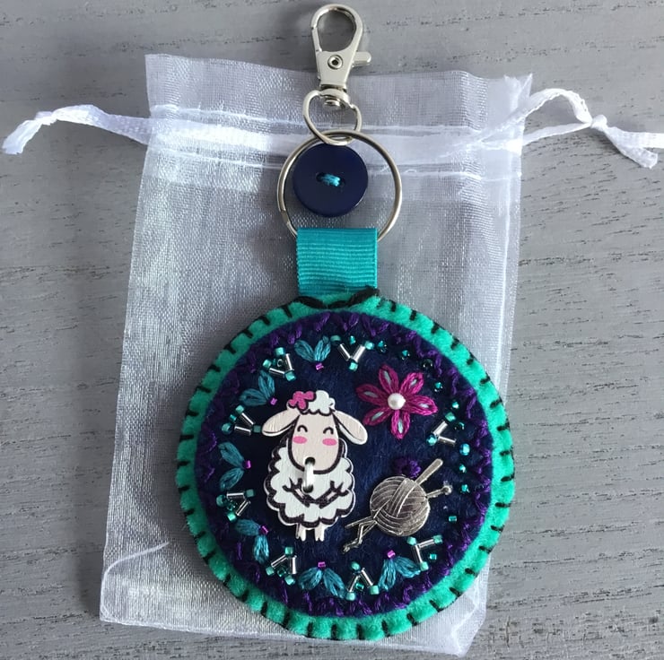 This Hand Embroidered Sheep Knit Bag Charm or Key ring is a perfect birthday, thank you, friendship or Christmas gift ….for anyone who loves Knitting or Sheep……or to treat yourself.