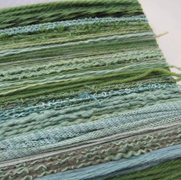 A mix of wools, viscose and cotton. Some are pure and some are blends. The wonderful thing about a mix like this is that the different materials pick up the dye differently, giving a variety of shades as well as textures.