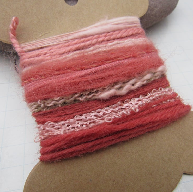 10 lengths of yarns, all approx 1m (40") long, hand dyed to a reds and pinks with natural dyes