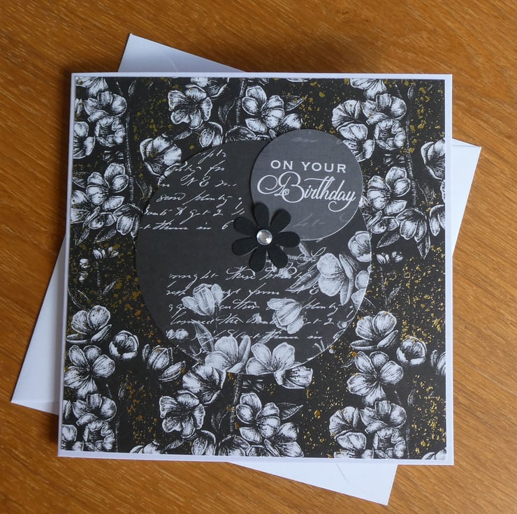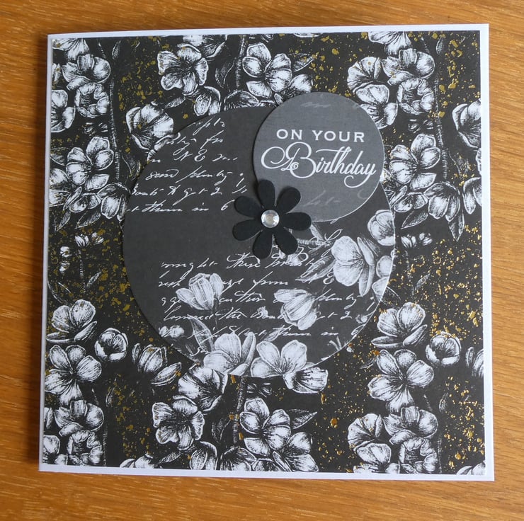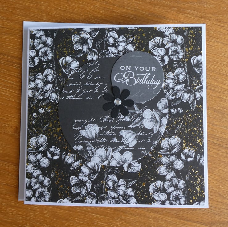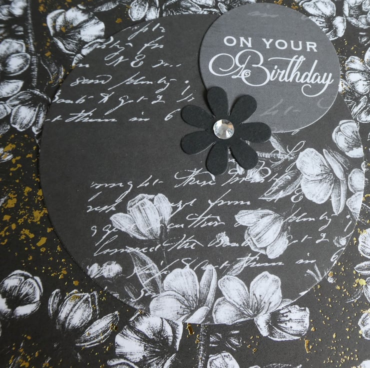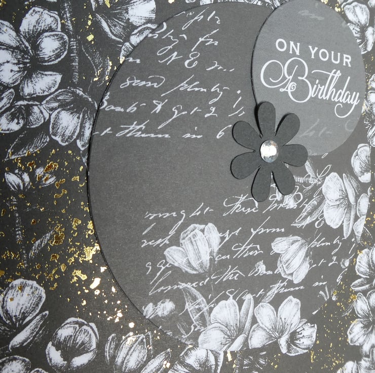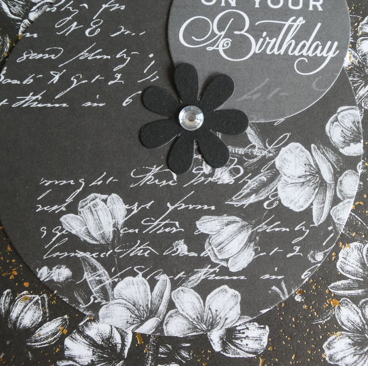 A circular topper has been added in the centre of the card with a grey and white floral and abstract script design. A small circular message with the words On Your Birthday has been offest at the top of the central topper and the design has been completed with a black paper flower with a clear faux gem centre.