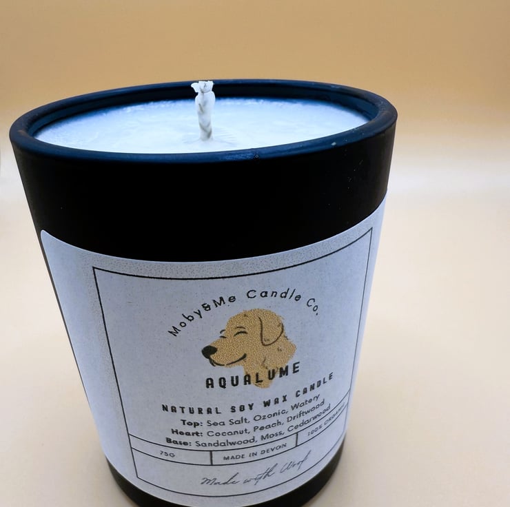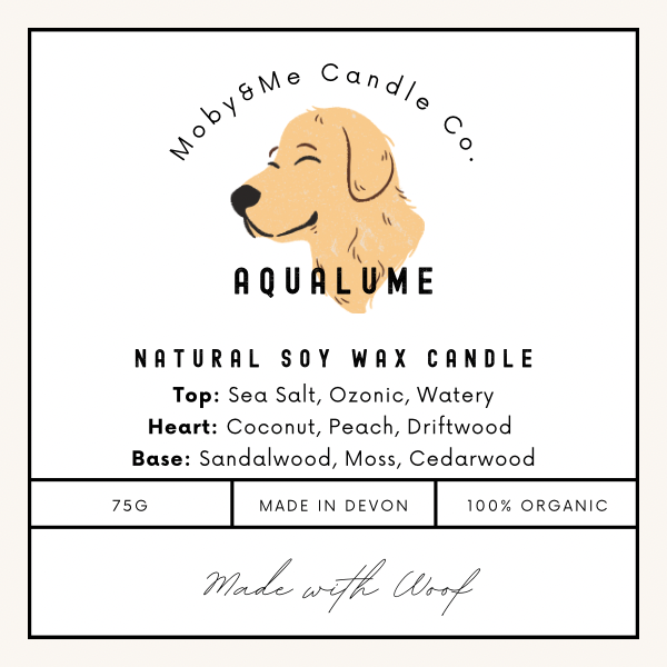 Introducing "Aqualume" by Moby&Me Candle Co., a natural soy wax candle crafted with care. This 75g, 100% organic candle is hand-poured in Devon and promises a refreshing, layered fragrance experience.
