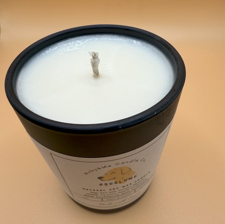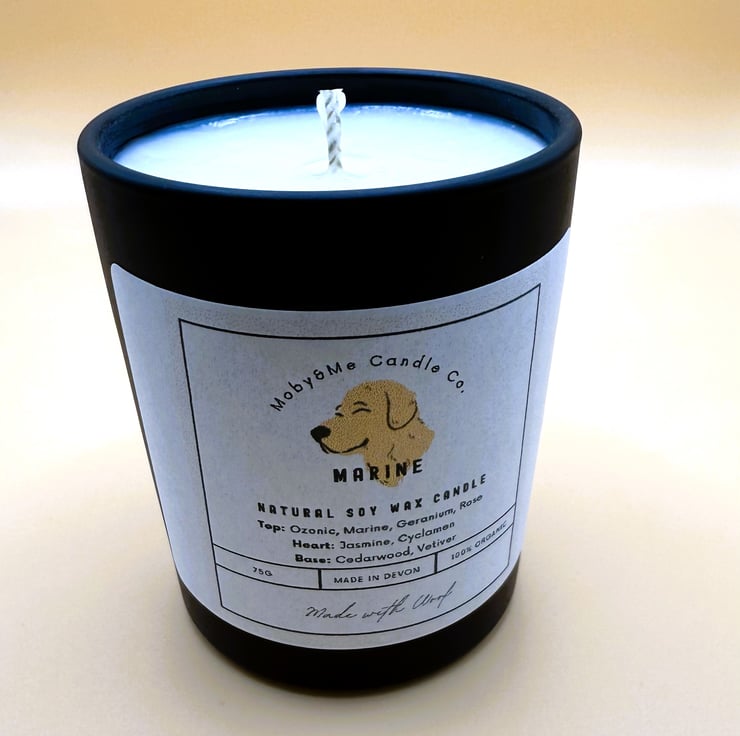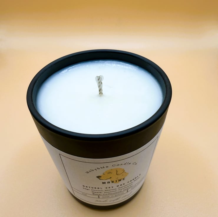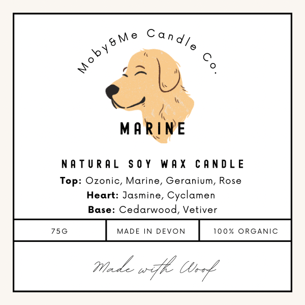 Introducing the "Marine" Natural Soy Wax Candle from Moby&Me Candle Co., crafted with care and a touch of charm. This 75g, 100% organic candle, proudly made in Devon, features an invigorating blend of scents: