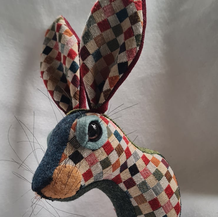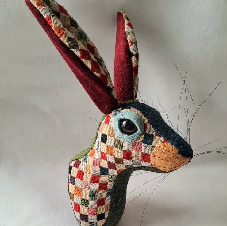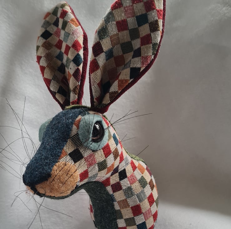 A lifesize faux hare which I have handmade and covered in hand stitched harlequin tapestry fabric. The head is backed with felt and has a metal hanger to hang it on the wall. It is lightweight.