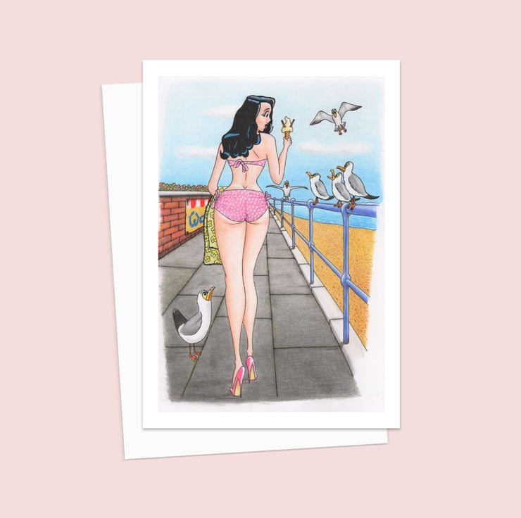 Original art illustrated greeting card for any occasion, featuring old style artwork inspired by mid century British postcards. It features a hand-drawn pencil illustration of a young woman enjoying her outing by the sea, until being surrounded by curious seagulls, interested in her ice-cream.