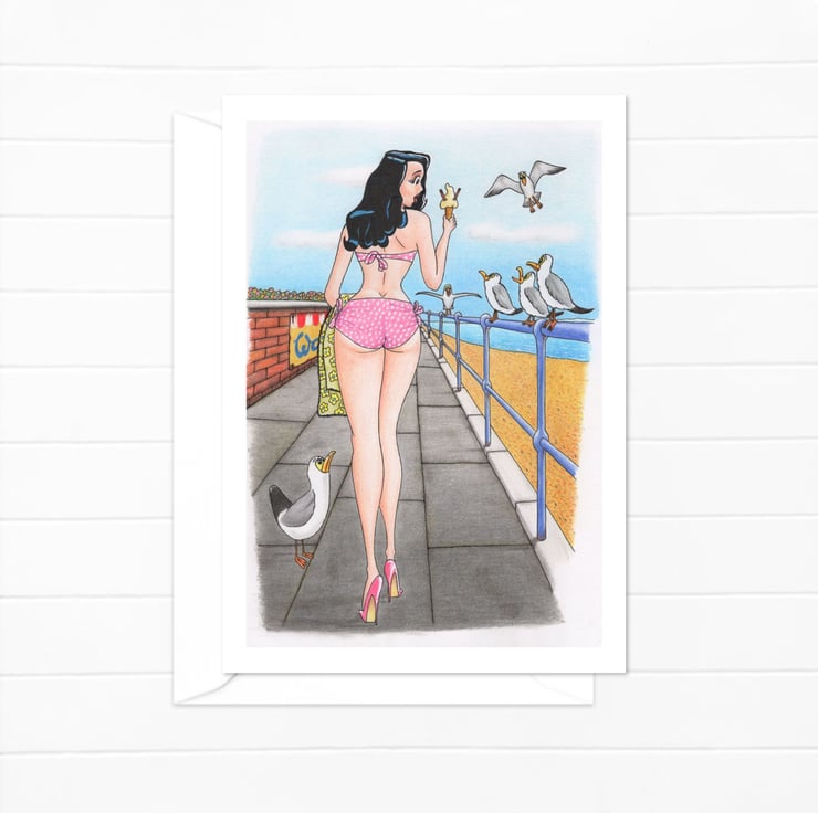 Original art illustrated greeting card for any occasion, featuring old style artwork inspired by mid century British postcards. It features a hand-drawn pencil illustration of a young woman enjoying her outing by the sea, until being surrounded by curious seagulls, interested in her ice-cream.