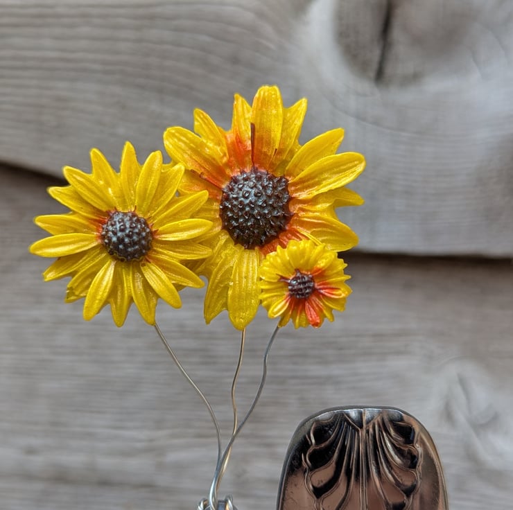 Her twisted trunk hold 3 bright sunflower cast in resin.