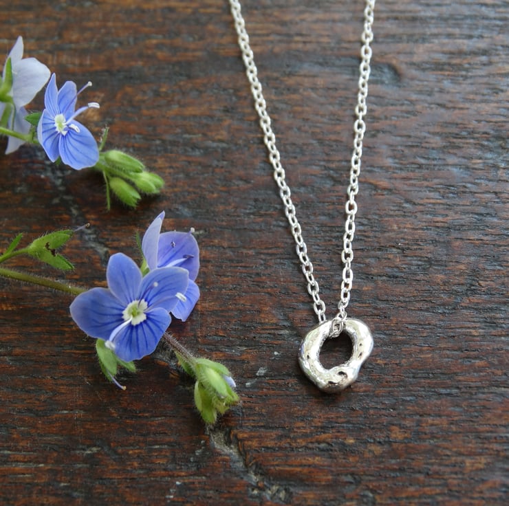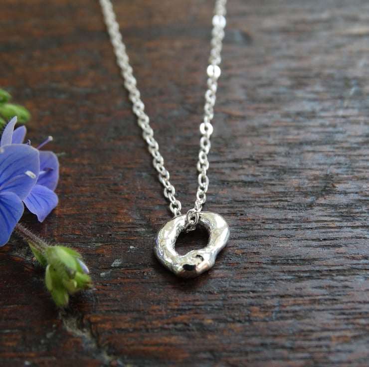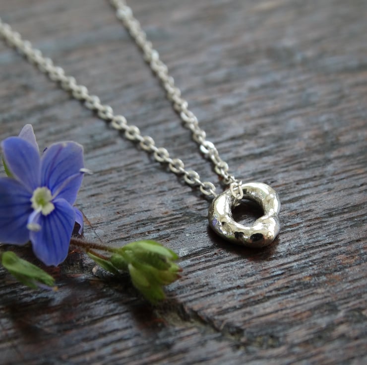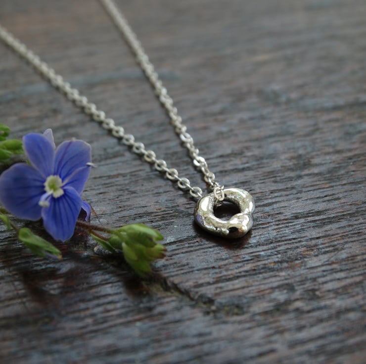 A tiny charm, resembling a hagstone (or holey stone). Simple in style, it can be worn on its own and looks lovely layered with other necklaces.