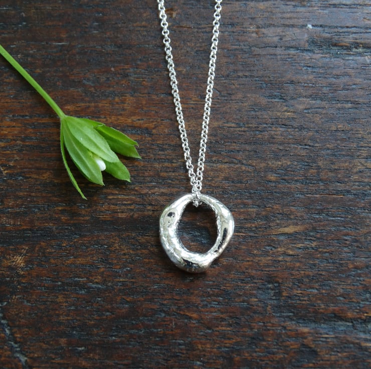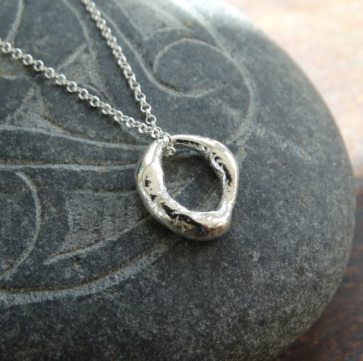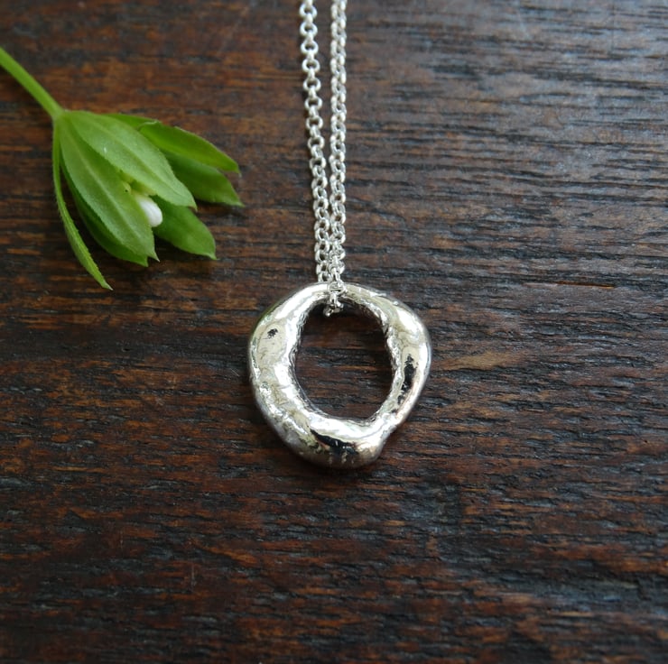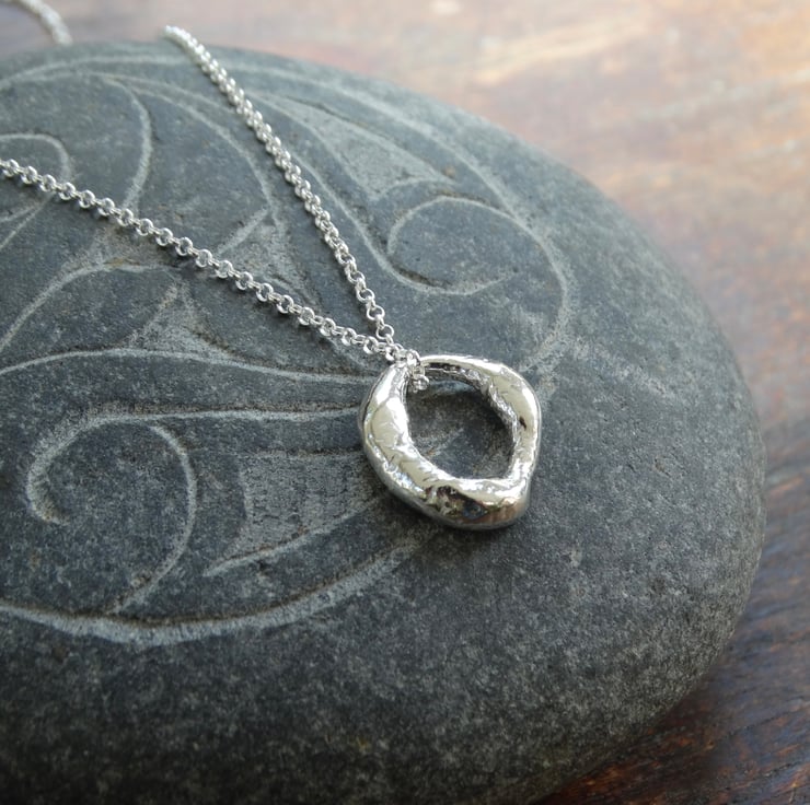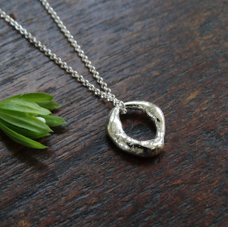 A simple, stylish pendant, inspired by the hagstones (holey stones) I sometimes find when beach combing. It has been made melting little off-cuts of silver into shape. The process is serendipitous, so each charm I make is different to the next.
