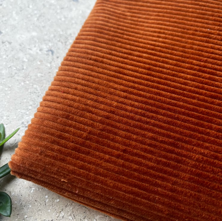It is backed with tan corduroy fabric from a sample swatch leftover from the fashion industry. The pouch is fully lined with beige cotton with a tiny checked pattern. There is a layer of interfacing to give the bag some structure.